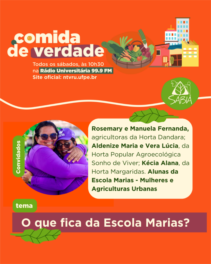 Hoje, nossa conversa é 100% com elas: as MARIAS – que fizeram e fazem a Escola MARIAS permanecer viva. Conversamos com as alunas, hoje formadas na Escola de Agriculturas Urbanas, mulheres que seguem cultivando alimento, autonomia e organização nos seus territórios.