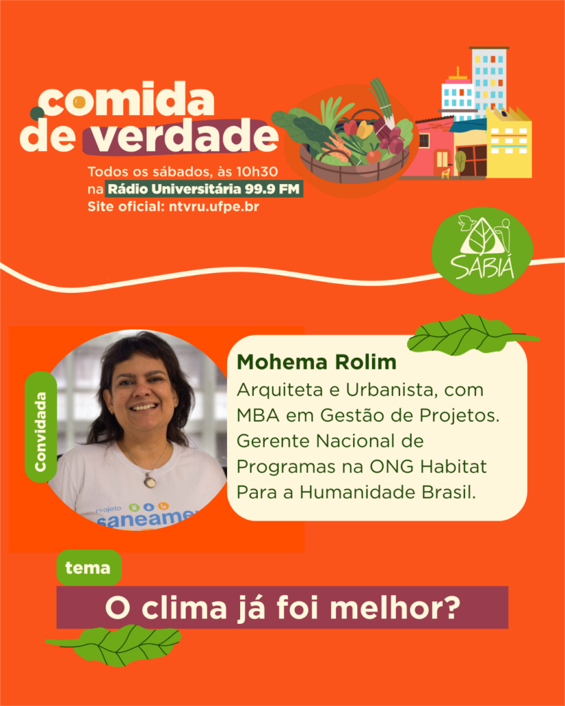 O clima já foi melhor? É sobre essas questões que conversamos no Comida de Verdade. Quem participa da conversa é Mohema Rolim, arquiteta e urbanista, com MBA em Gestão de Projetos. Mohema é gerente nacional de programas na ONG Habitat Brasil, onde atua em iniciativas voltadas à habitação social, intervenções em assentamentos precários e melhorias habitacionais e comunitárias.